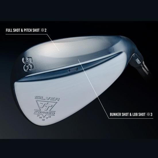 SILVERはサテンフィニッシュの印、軟鉄20C素材を精密鍛造したボディーの全体を、CNCマシン加工で削り出して作り上げたれたウェッジです。ソール面には、三つの段差が設けられ、それぞれの場面でその箇所を意識して打つことにより、素晴らしいウェッジショットが生み出されます。フェース面にはフルスコアラインがマシンカットで彫刻され、構えやすさと同時に強烈なスピン性能を発揮します。