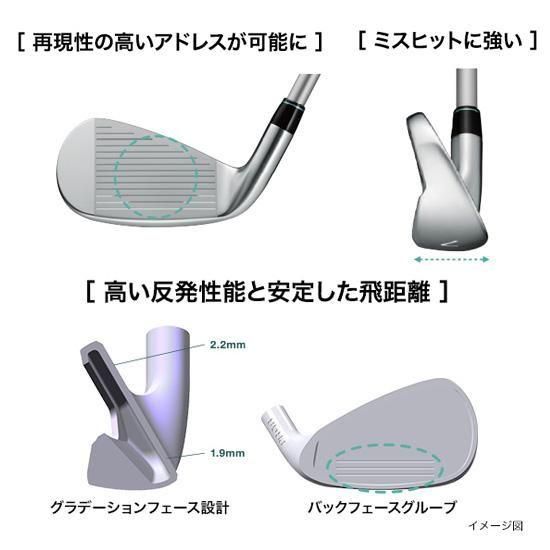 女性ゴルファーに多いスウィープなスイング(払い打ち)に対応したグラデーションフェースを搭載。フェースの下打点にかけて徐々に薄肉化し、打点がバラついても高い反発性能を発揮。また、裏面にバックフェースグルーブを搭載し、たわみ効果をUP。どの番手も安定した距離を打つことができます。